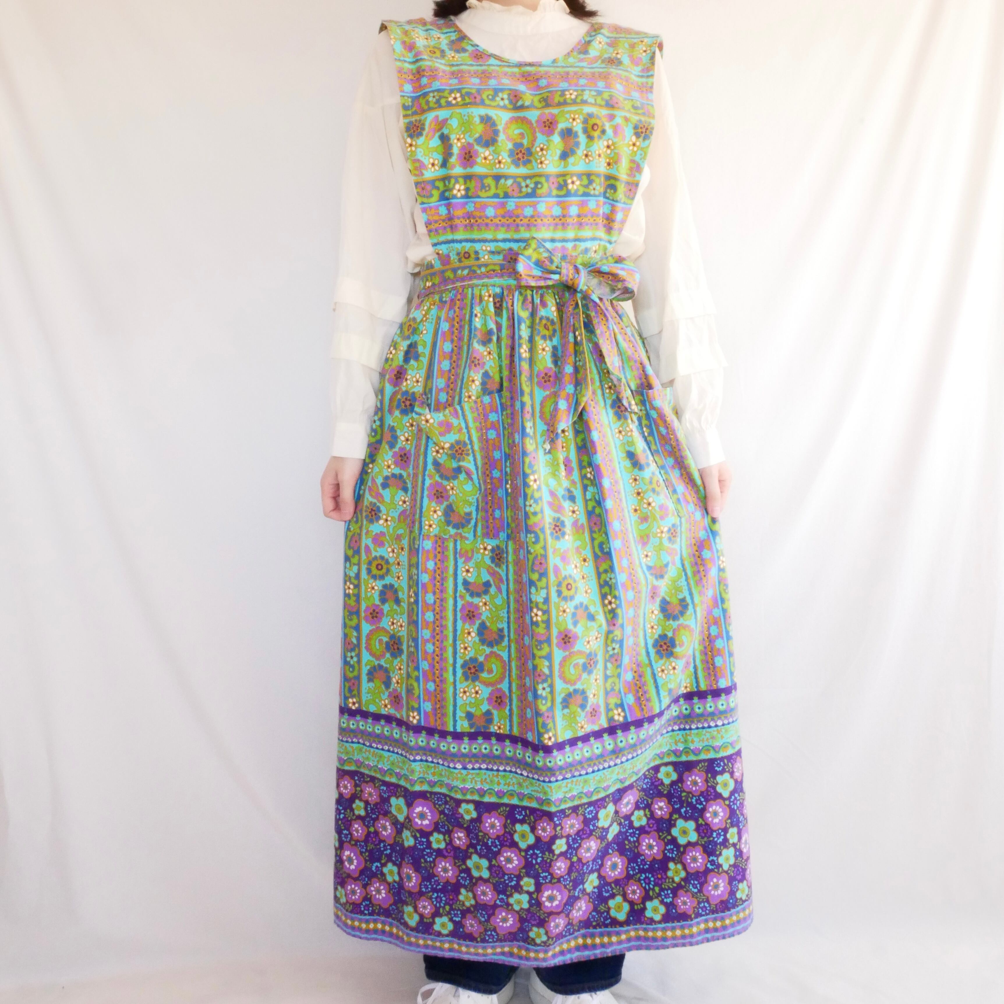 ウエストにリボンがついていて、サイズ調節ができるエプロン型のワンピースです。