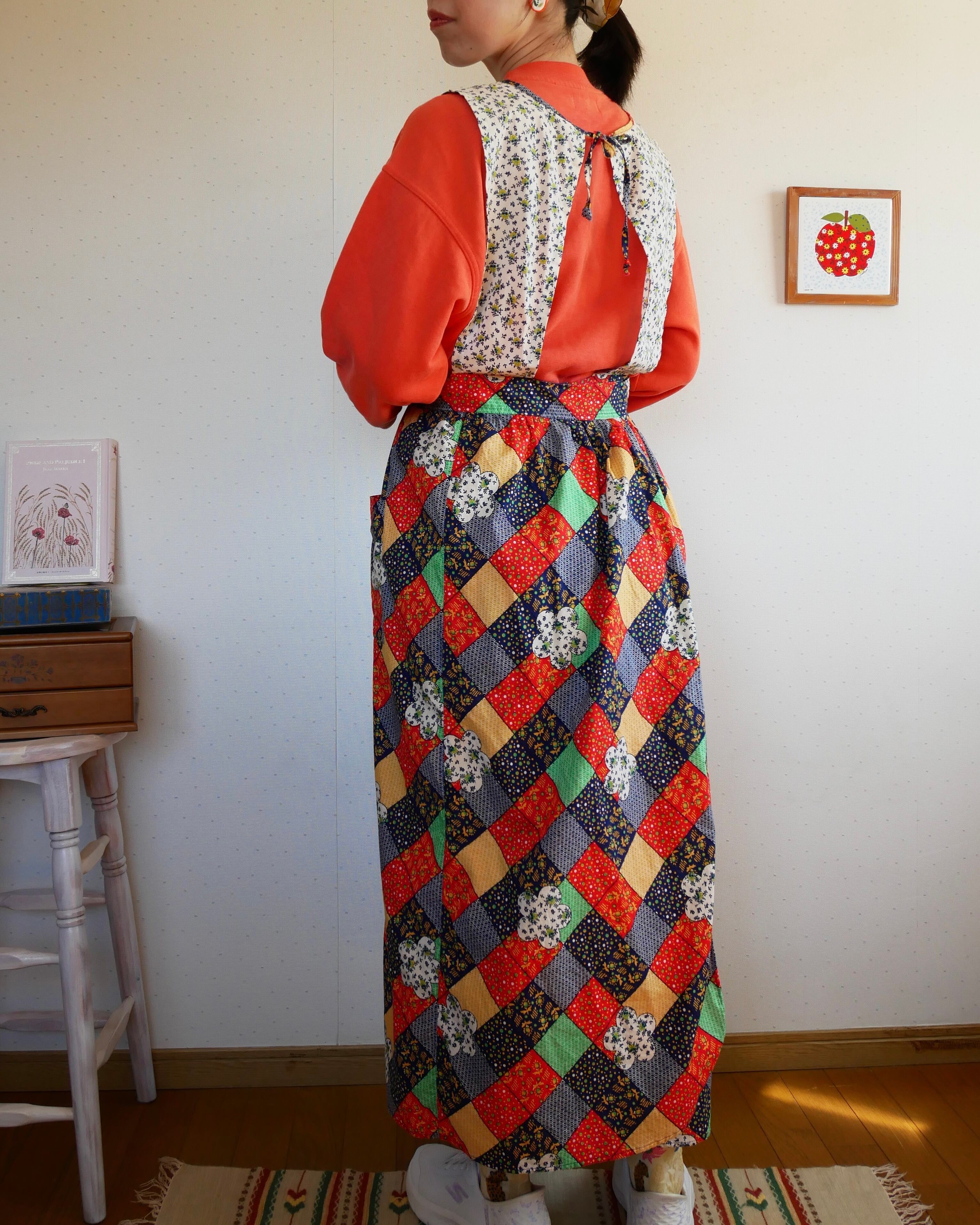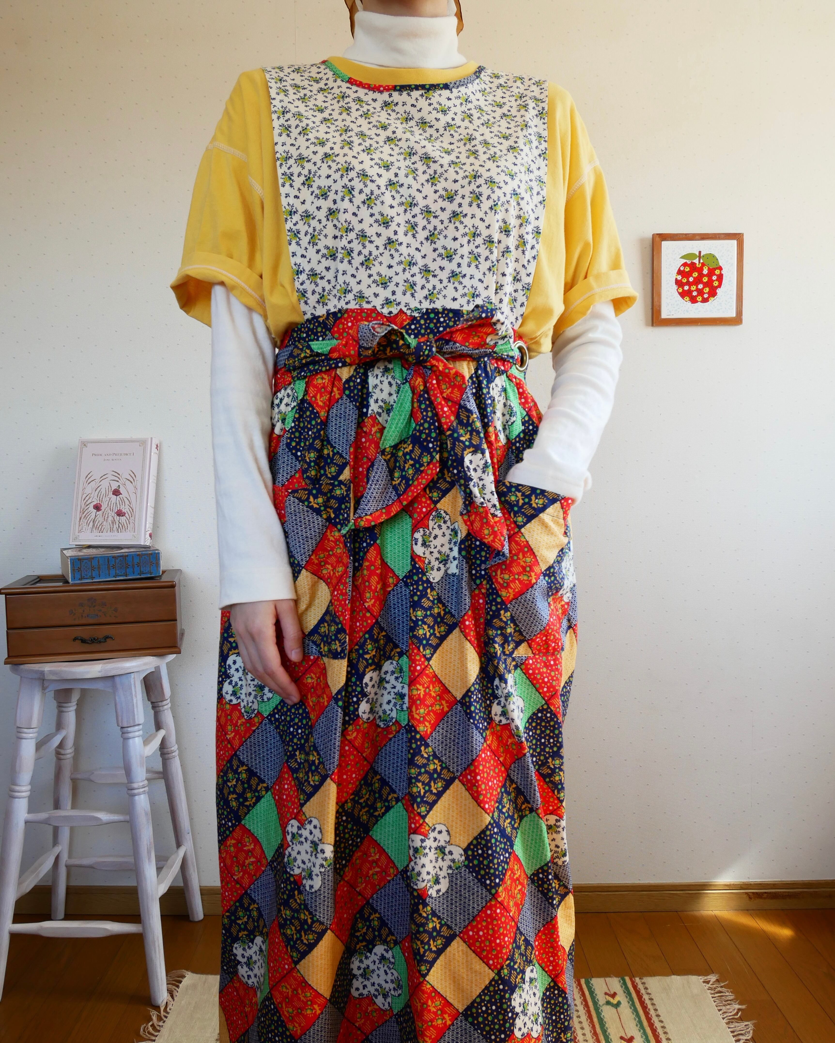 ウエストにリボンがついていて調節ができる、エプロン型のワンピース。