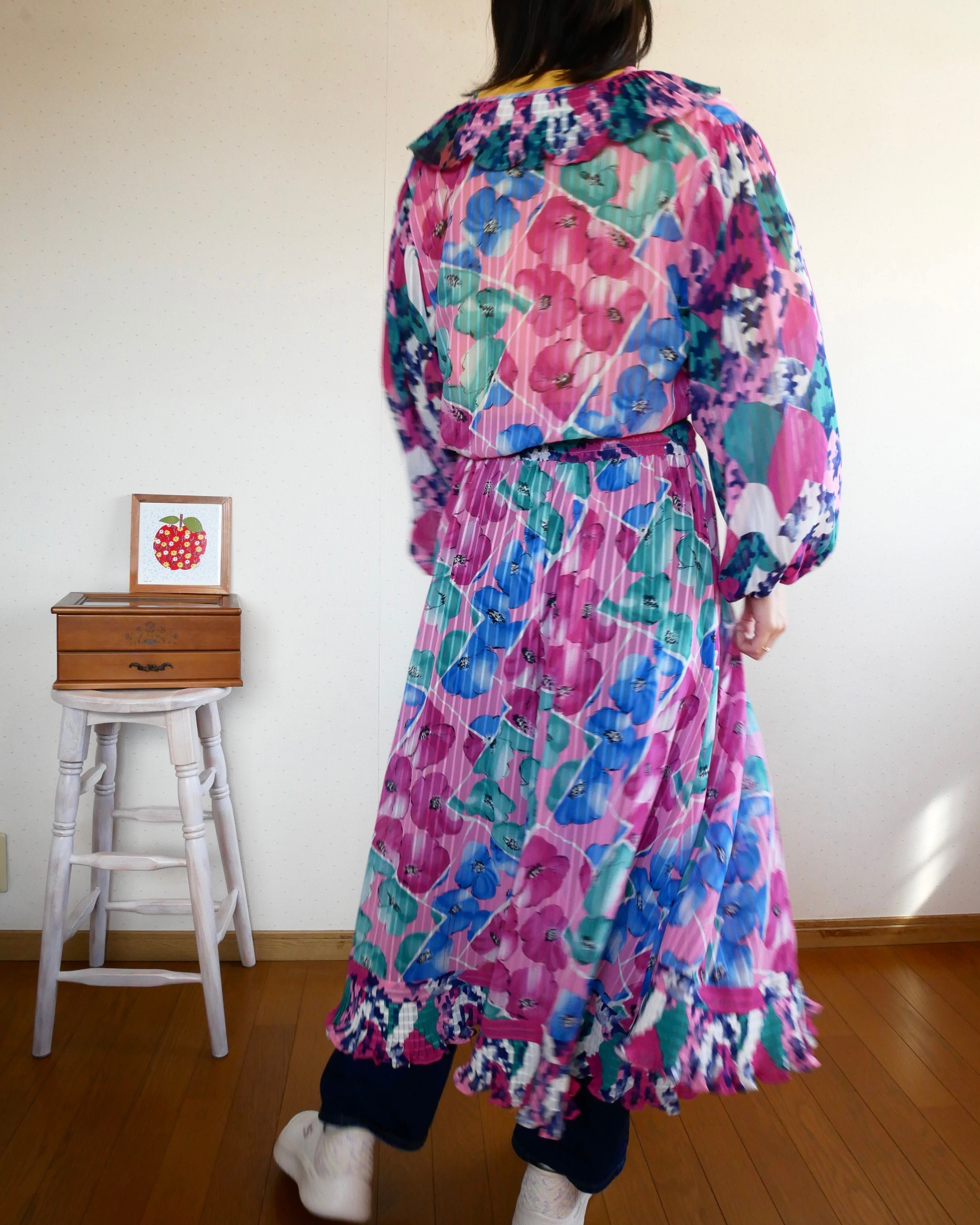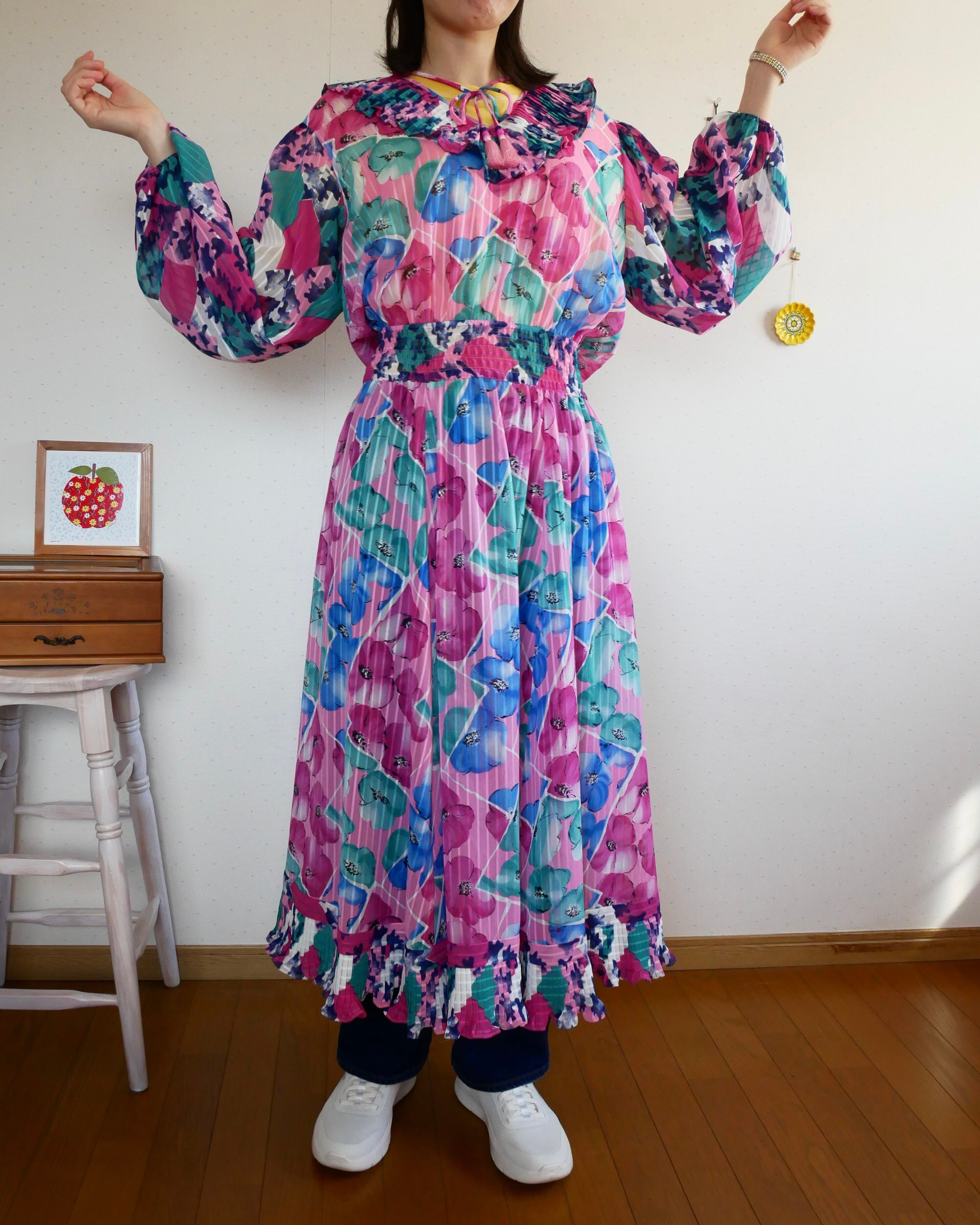 ピンク色のワンピース に水彩画のように瑞々しいパンジーのようなお花のデザイン。