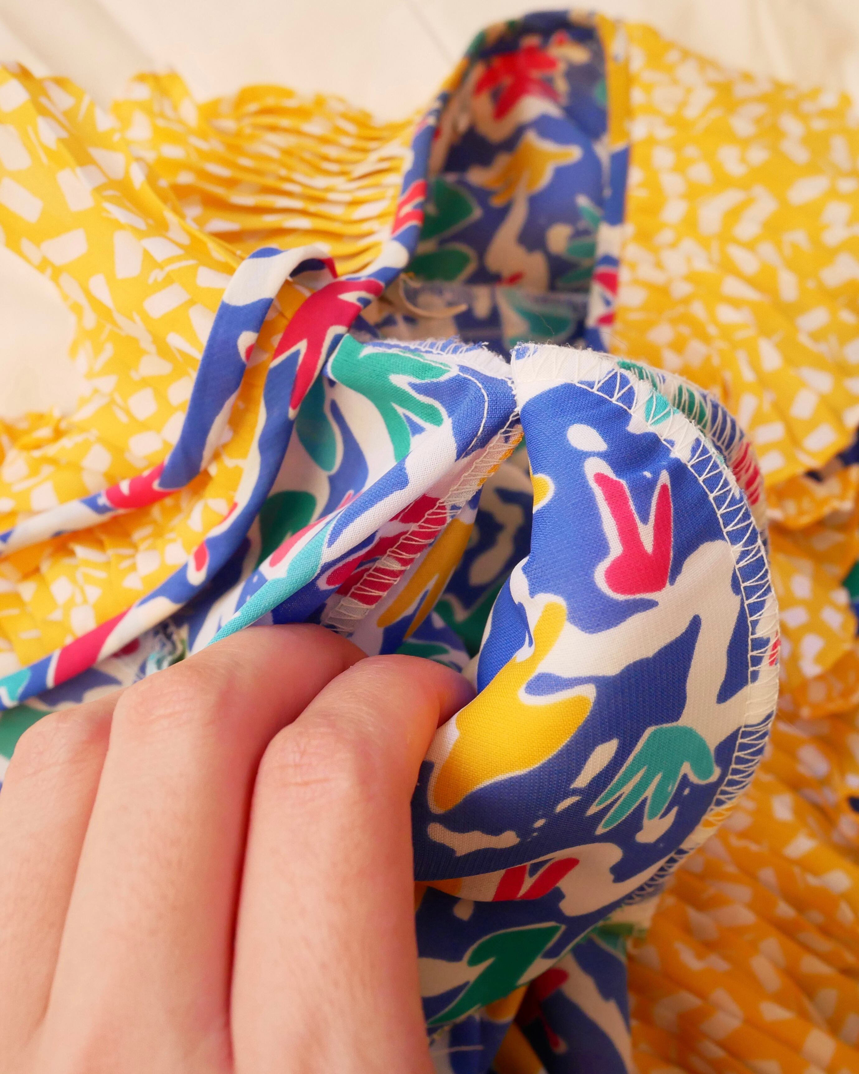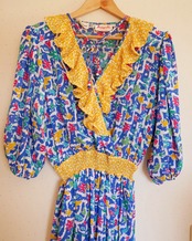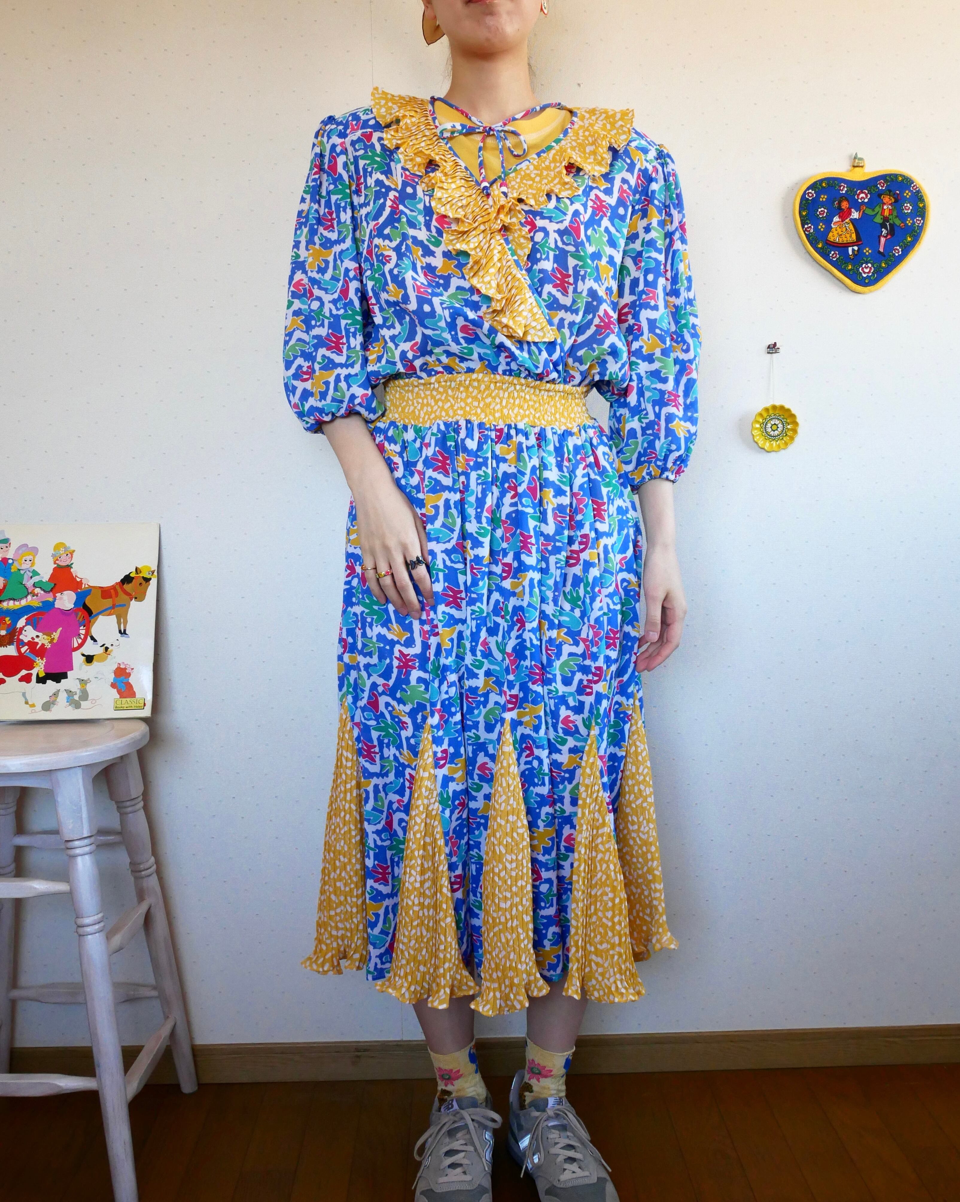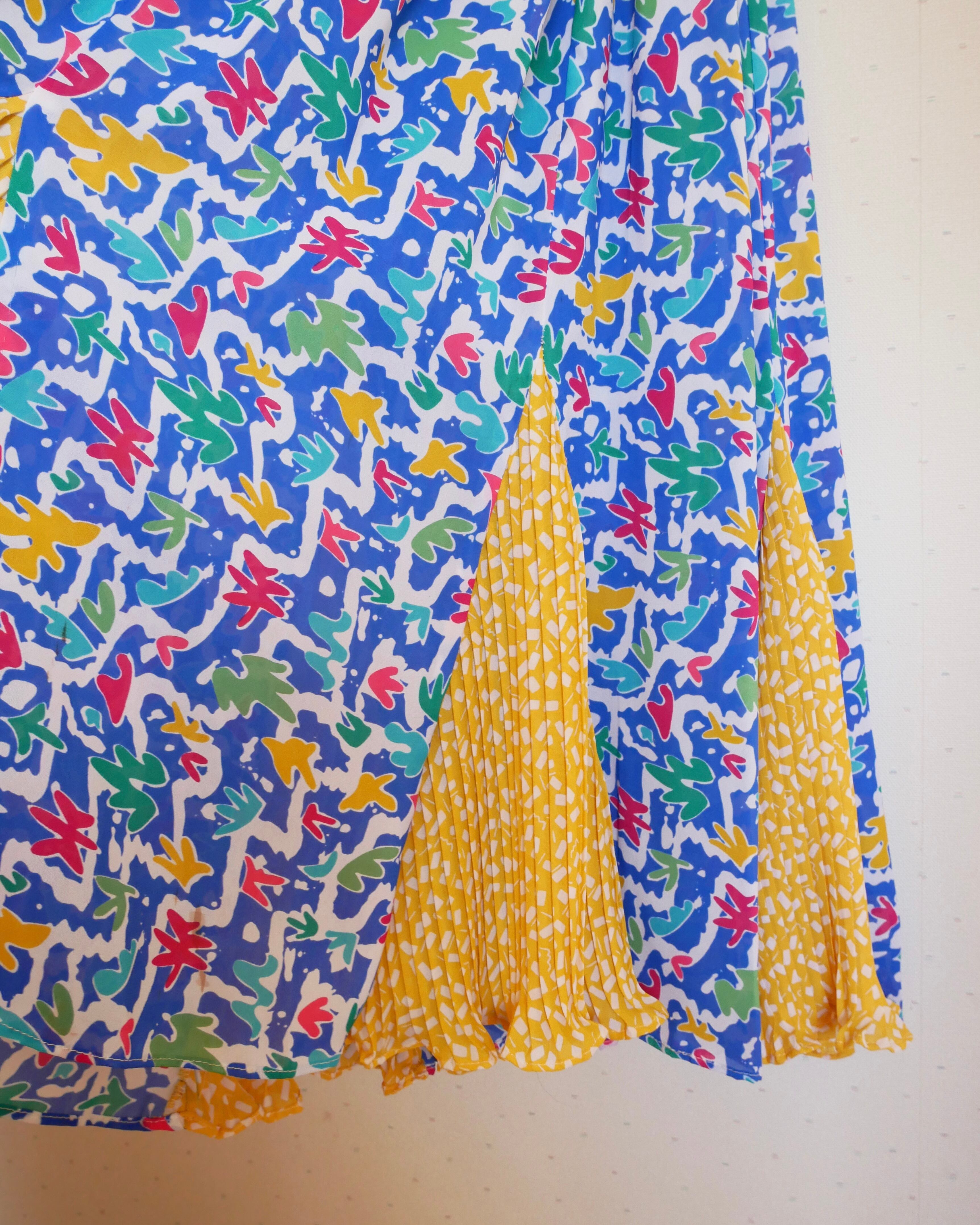 上質なポリエステルジョーゼットの生地を使った鮮やかなプリント、大胆な柄パターンの組み合わせが特徴。