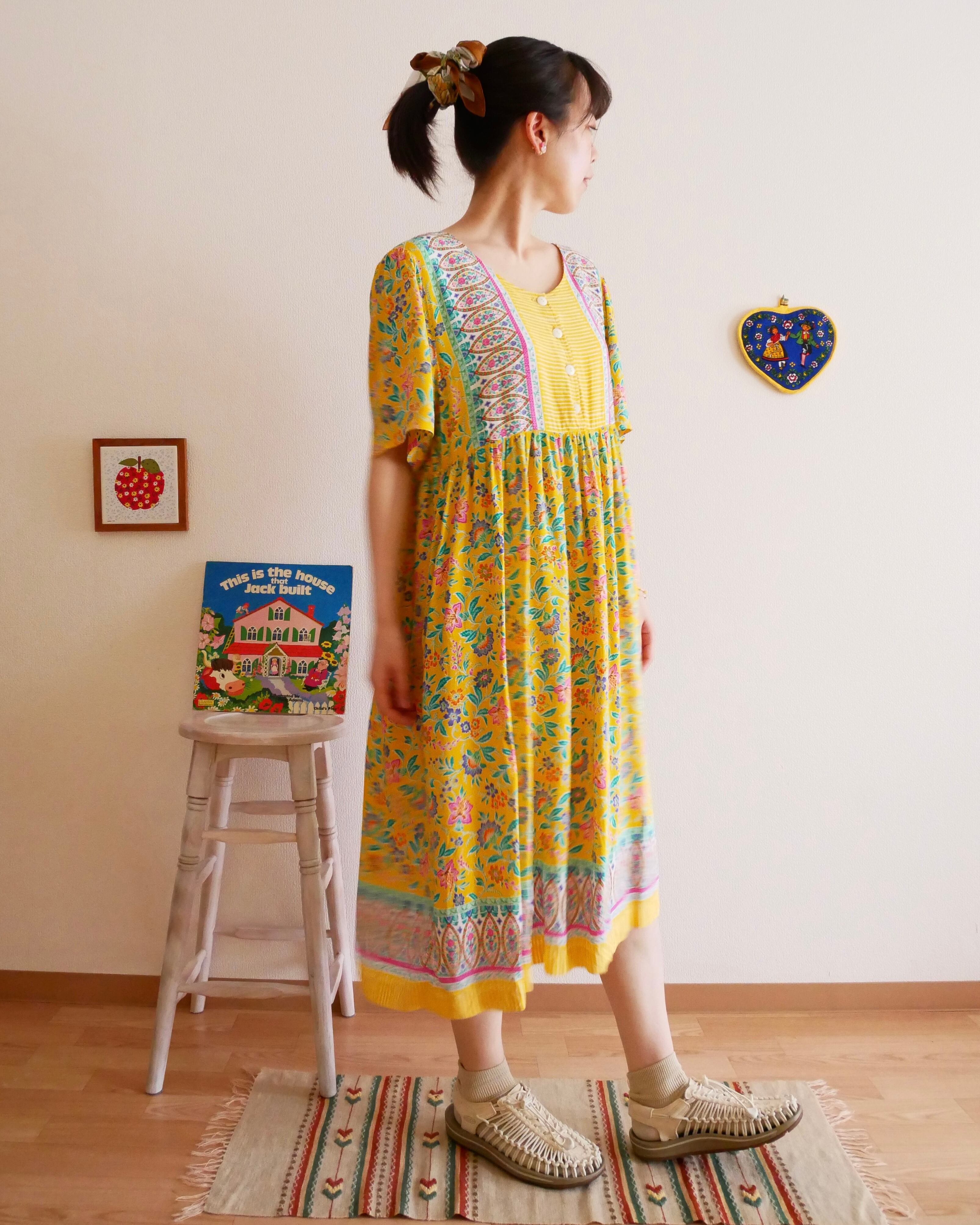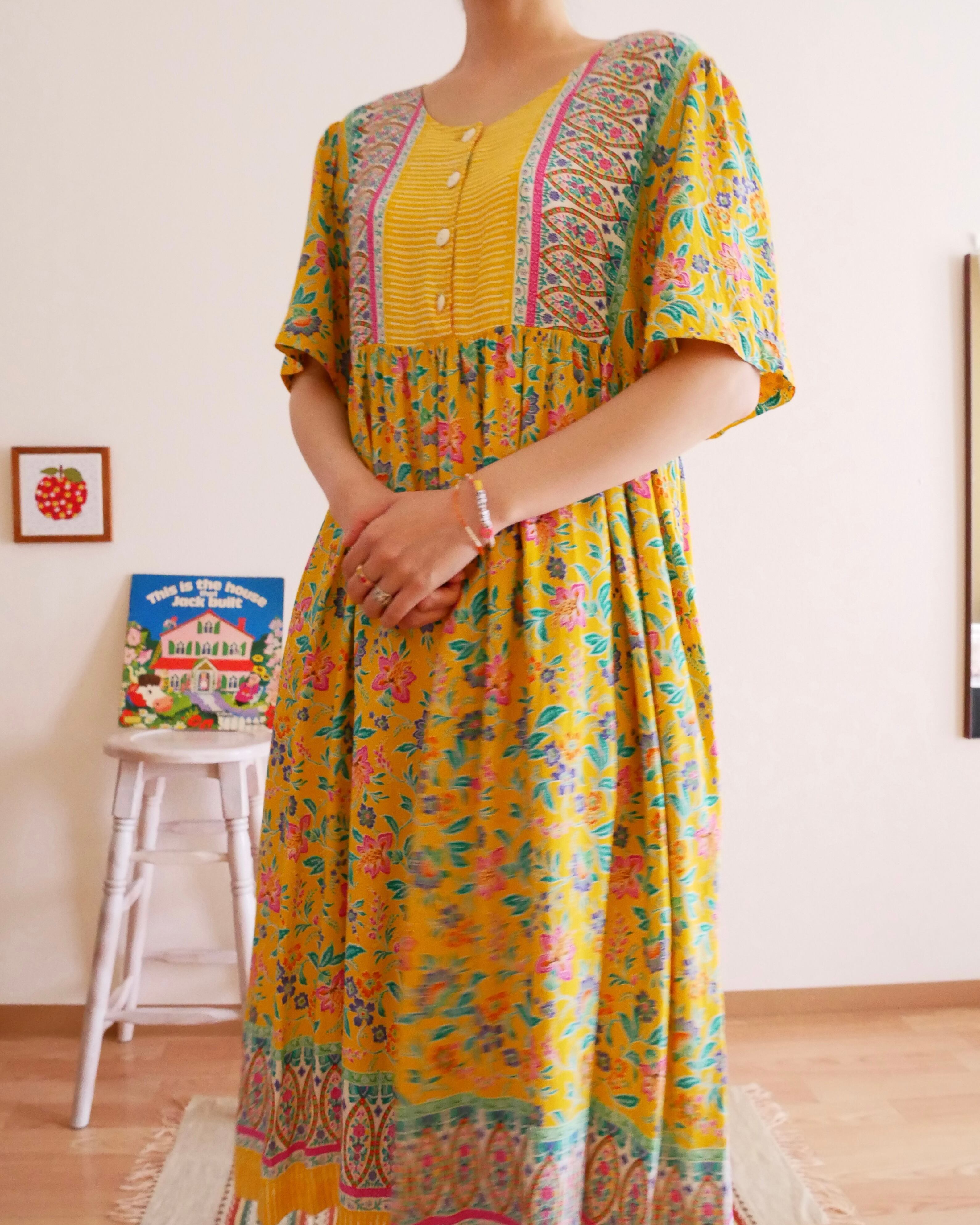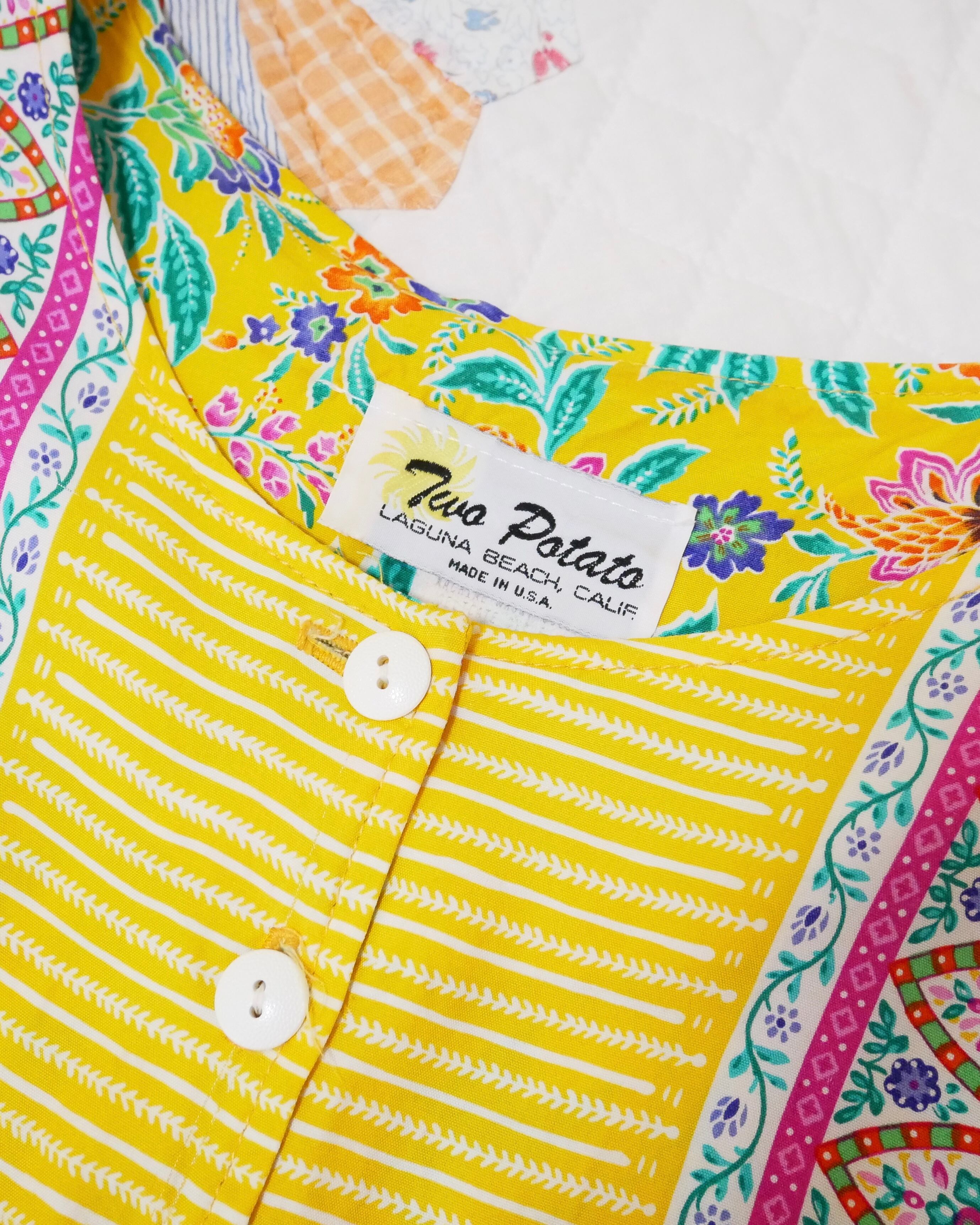 南国のような色鮮やかなピンクやパープルのお花。胸のサイドのプリントも凝っていて